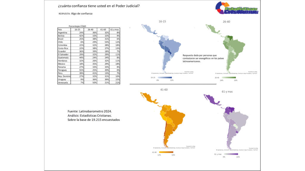 La confianza parcial —expresada como «algo de confianza»— en el Poder Judicial entre los evangélicos latinoamericanos revela, según los datos del Latinobarómetro 2024 sobre la base de 19.215 encuestados, una geografía de adhesión institucional moderada que merece una lectura detenida en tanto constituye, en muchos países y grupos etarios, la respuesta mayoritaria entre quienes no han abandonado del todo la esperanza en el sistema judicial pero tampoco le otorgan una confianza plena. En el grupo de 16 a 25 años, Paraguay lidera con un destacado 55%, seguido por Guatemala con 44%, Bolivia con 42% y Perú con 39%, mientras Ecuador alcanza 36% y El Salvador 29%, configurando un arco juvenil donde la confianza moderada predomina sobre el escepticismo absoluto. En el grupo de 26 a 40 años, Venezuela sorprende con el porcentaje más alto de toda la tabla con un 50%, seguida por Uruguay con 36% y Perú con 41%, en tanto Brasil y Costa Rica empatan en 38% y Argentina registra 36%, revelando que en la adultez temprana la confianza parcial se distribuye de manera más homogénea que en otros grupos. Entre los de 41 a 60 años, Chile lidera con un notable 53%, seguido por Uruguay con 39% y Colombia con 28%, mientras que en el grupo de 61 años y más, Colombia encabeza con 18% —siendo el porcentaje máximo de ese grupo—, evidenciando que la confianza parcial se contrae significativamente en la generación mayor, con escala que va de 0% a 21% según los mapas. Este panorama general sugiere que la confianza parcial funciona como el reservorio principal de legitimidad judicial que aún sostiene el tejido cívico en muchas naciones, y que su comprensión pastoralmente responsable exige una atención diferenciada por generación y por contexto nacional.