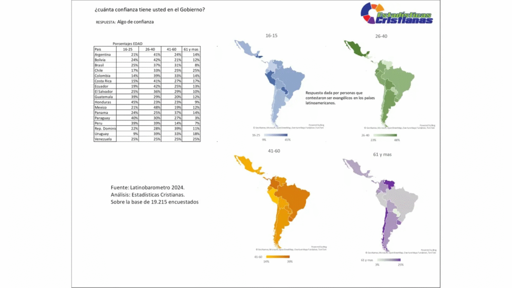 El análisis de la respuesta «Algo de confianza» ante la pregunta sobre el nivel de confianza en el Gobierno, registrada en el Latinobarómetro 2024 sobre una base de 19,215 encuestados evangélicos de diecisiete países latinoamericanos, revela que la confianza condicionada y parcial hacia el poder ejecutivo constituye la postura dominante y transversalmente compartida del evangelicalismo regional, superando en la mayoría de los contextos nacionales tanto a la confianza plena como a la desconfianza total. En el grupo de 16 a 25 años, Honduras lidera con 45%, seguido por Guatemala con 39%, Perú con 39%, Paraguay con 40% y Bolivia con 24%, con un rango que va del 9% de Uruguay al 45% de Honduras. En la cohorte de 26 a 40 años, México encabeza con 48%, seguido por Bolivia con 42%, Ecuador con 42%, Argentina con 41%, Costa Rica con 41% y Uruguay con 39%, configurando un rango del 23% al 48% que es el más homogéneo y elevado de toda la tabla. Los datos en su conjunto dibujan un evangelicalismo latinoamericano que mayoritariamente no ha abandonado toda esperanza en el poder ejecutivo pero que tampoco le otorga una confianza plena, postura que desde la perspectiva pastoral representa tanto un logro de madurez cívica como un desafío urgente de formación política que las iglesias no pueden ignorar.