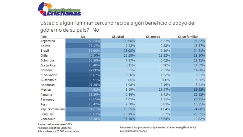 La recepción de beneficios familiares (donde tanto el encuestado como familiares cercanos reciben apoyo) alcanza niveles significativos en México (38.92%), Chile (28.10%), República Dominicana (24.80%), Brasil (24.21%) y Panama (21.52%). Estos porcentajes indican que aproximadamente uno de cada cuatro a tres hogares evangélicos en estos países accede a múltiples beneficios gubernamentales distribuidos entre miembros familiares, sugiriendo programas con cobertura amplia que alcanzan varios integrantes de núcleos familiares. Argentina (21.33%), Uruguay (20.25%) y Paraguay (20.95%) también superan el 20% con beneficios familiares múltiples. En contraste, El Salvador (6.31%), Guatemala (6.36%), Honduras (5.41%) y Costa Rica (14.59%) presentan cobertura familiar significativamente menor, indicando que menos de uno de cada diez a siete hogares evangélicos en estos países recibe múltiples beneficios gubernamentales distribuidos entre miembros.