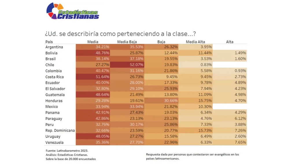 El panorama de autopercepción de clase social evangélica latinoamericana revela cinco realidades simultáneas: predominio de identidad de clase media (38% promedio), significativa presencia en clase media-baja (30% promedio), considerable identificación con clase baja (21% promedio), mínima representación en clase media-alta (8% promedio) y casi inexistente presencia en clase alta (3.5% promedio). La suma de clase baja, media-baja y media alcanza aproximadamente 89% regional, indicando que nueve de cada diez evangélicos latinoamericanos se perciben en los tres escalones inferiores o medios de estratificación social. Solo 11.5% combinado se identifica como clase media-alta o alta, revelando ausencia casi total de evangélicos en estratos socioeconómicos superiores. Honduras presenta el patrón más complejo con 30.66% clase baja (el más alto regional) pero simultáneamente 20.45% en estratos medios-altos y altos combinados (también entre los más altos), sugiriendo profunda polarización socioeconómica dentro de comunidades evangélicas hondureñas. Chile muestra el porcentaje más bajo de clase alta (0.83%) combinado con el más alto de clase media-baja (52.07%), indicando que evangélicos chilenos enfrentan particular concentración en vulnerabilidad económica. Costa Rica destaca con 51.64% identificándose como clase media y solo 9.45% como clase baja, reflejando percepciones de mayor estabilidad económica comparativa. Esta concentración masiva en estratos medios y bajos presenta desafíos pastorales significativos para iglesias que ministran congregaciones con limitados recursos económicos, acceso educativo restringido y oportunidades de movilidad social reducidas, mientras simultáneamente revela oportunidad para que el evangelio demuestre su poder transformador precisamente entre aquellos que el mundo considera económicamente marginados pero que Dios ha escogido para ser ricos en fe y herederos de su reino eterno.Retry
