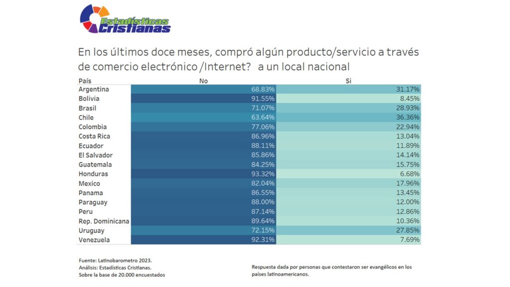 Los países con mayor adopción de comercio electrónico revelan evangélicos más integrados en economías digitales. Chile (36.36%), Argentina (31.17%), Brasil (28.93%) y Uruguay (27.85%) presentan aproximadamente uno de cada cuatro a tres evangélicos comprando online en locales nacionales, sugiriendo infraestructura de comercio electrónico funcional, conectividad digital accesible, sistemas de pago online confiables y demografía evangélica con recursos y alfabetización suficientes para participar en economías digitales. Colombia (22.94%), México (17.96%), Guatemala (15.75%) y El Salvador (14.14%) ocupan posiciones intermedias con aproximadamente 15-23% de adopción. Estos porcentajes, aunque modestos comparados con países desarrollados, representan minorías significativas que han cruzado umbral hacia consumo digital, potencialmente influyendo a círculos sociales hacia adopción futura.
