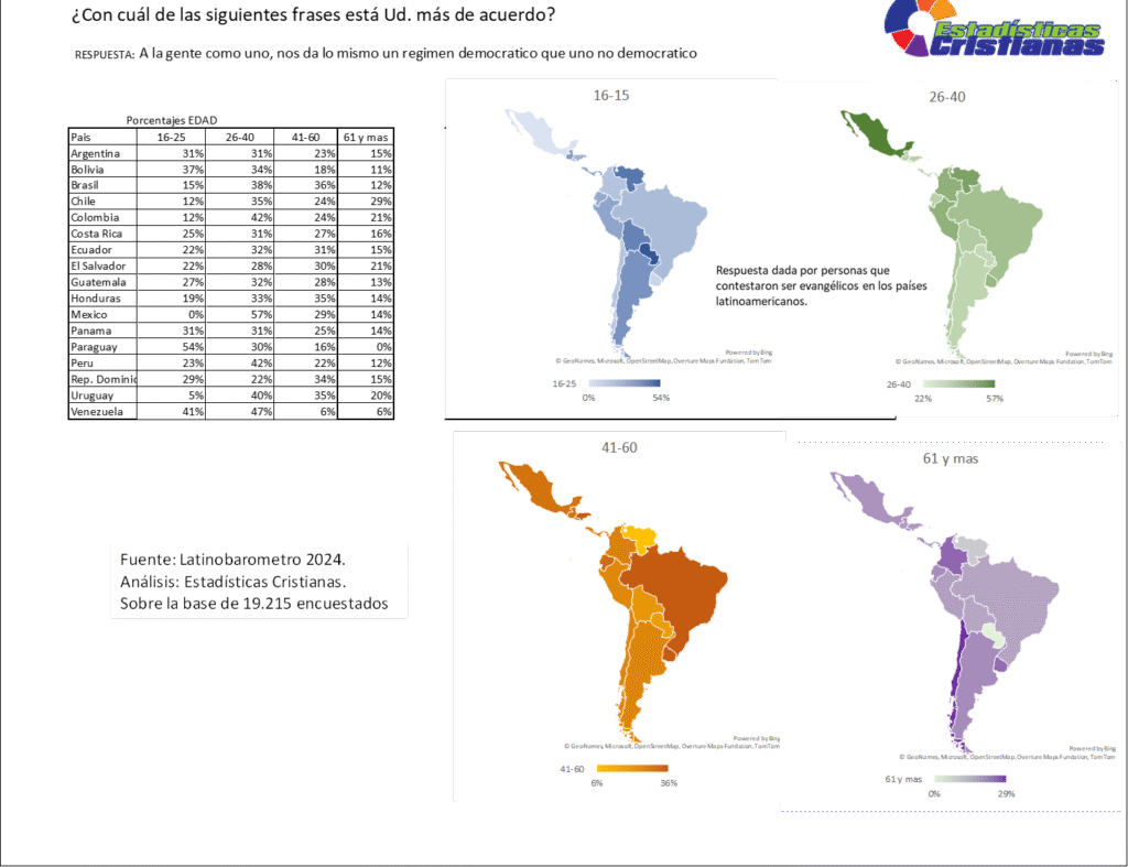 El grupo etario de 16-25 años evidencia niveles alarmantemente elevados de indiferencia democrática en varios contextos, con Paraguay liderando con 54%, seguido por Venezuela con 41%, Bolivia con 37%, Panamá y Argentina ambos con 31%, República Dominicana con 29%, Guatemala con 27%, Costa Rica con 25%, Perú con 23%, El Salvador y Ecuador ambos con 22%, Honduras con 19%, Brasil con 15%, Colombia con 12%, Chile con 12%, mientras México registra 0% y Uruguay 5%. Los mapas indican que este segmento representa entre 0% y 54% de los evangélicos indiferentes al tipo de régimen, revelando que los jóvenes adultos evangélicos muestran desconexión preocupante con valores democráticos, posiblemente relacionada con desilusión generacional ante corrupción política endémica, promesas incumplidas de gobiernos democráticos, exposición a discursos autoritarios populistas en redes sociales, o déficit en educación cívica cristiana que articule conexiones entre evangelio y sistemas políticos justos, demandando urgentemente programas formativos que equipen a nuevas generaciones para participación cívica informada por valores bíblicos de justicia, verdad y dignidad humana.
