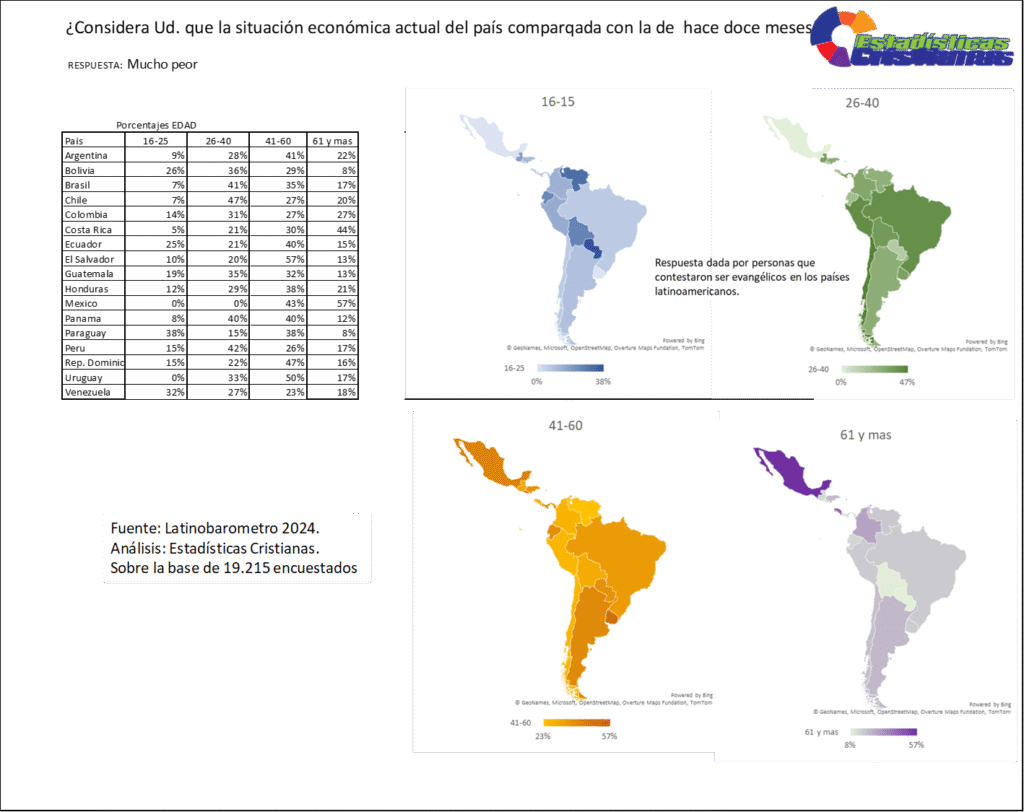 El grupo de 61 años y más presenta porcentajes catastróficos de percepción de deterioro económico severo, con patrones que reflejan vulnerabilidad extrema de adultos mayores. México encabeza dramáticamente con 57%, seguido por Argentina con 22%, Honduras con 21%, Chile con 20%, Colombia con 27%, Venezuela con 18%, Brasil con 17%, Uruguay con 17%, República Dominicana con 16%, Ecuador con 15%, El Salvador con 13%, Panamá con 12%, Bolivia con 8%, Paraguay con 8%, mientras Costa Rica, Guatemala y Perú registran niveles entre 7% y 13%. La visualización cartográfica indica que este segmento representa entre 7% y 57% de los que perciben deterioro severo, evidenciando que los adultos mayores evangélicos experimentan catástrofe económica terminal, posiblemente reflejando aniquilación total de poder adquisitivo de pensiones, imposibilidad de costear medicamentos vitales, dependencia absoluta de caridad familiar o comunitaria para supervivencia diaria, o abandono de tratamientos médicos esenciales por imposibilidad económica, demandando urgentemente declaración de emergencia gerontológica nacional y movilización total de recursos eclesiales para proveer asistencia económica directa, alimentos, medicamentos y vivienda a adultos mayores evangélicos cuya situación económica no constituye simplemente pobreza sino amenaza existencial inmediata a su supervivencia física y dignidad humana básica.