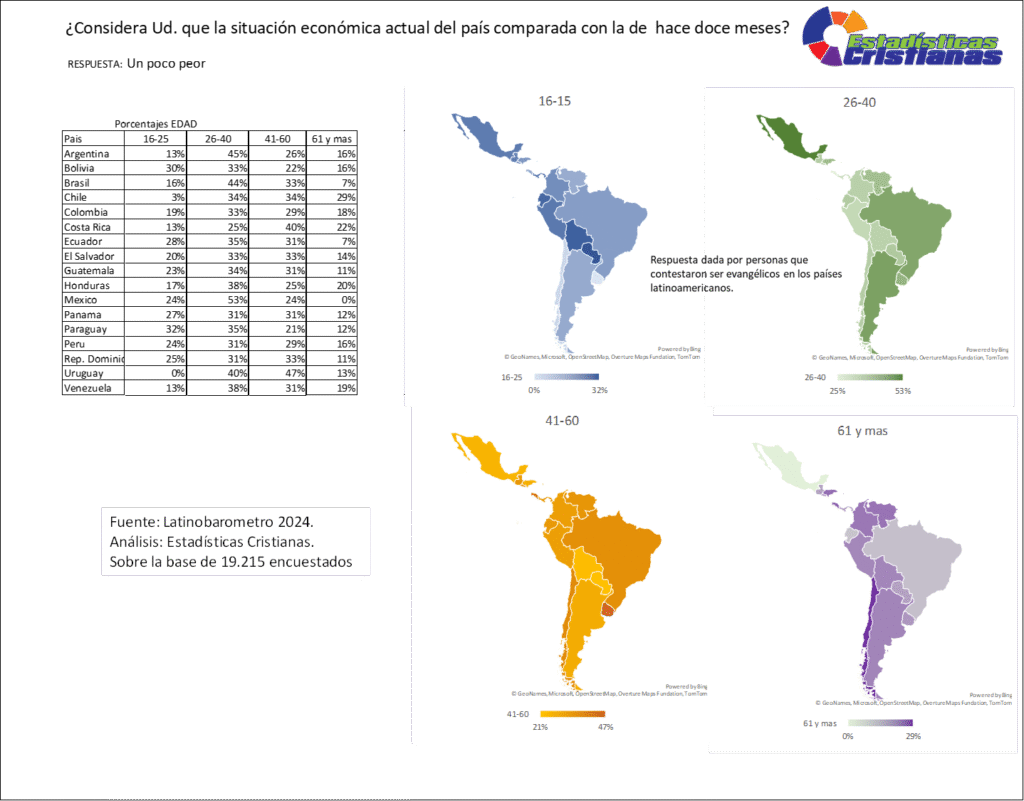 Los evangélicos latinoamericanos que consideran que la situación económica actual del país es un poco peor comparada con la de hace doce meses exhiben patrones diferenciados según grupo etario y contexto nacional, reflejando pesimismo económico moderado. El segmento de 26-40 años presenta las concentraciones más elevadas de percepción de deterioro moderado, destacando México con 53%, Argentina con 45%, Brasil con 44%, Uruguay con 40% y Venezuela con 38%. Los grupos de 41-60 años muestran niveles sustanciales, liderados por Uruguay con 47%, Costa Rica con 40%, Chile con 34%, Brasil y El Salvador ambos con 33%, y Ecuador con 31%. La franja de 16-25 años presenta porcentajes variables, con Paraguay alcanzando 32%, Bolivia con 30%, Ecuador con 28%, Panamá con 27%, Perú con 24% y México con 24%. El grupo de 61 años y más registra cifras moderadas, encabezado por Chile con 29%, Argentina con 16%, Perú con 16%, Colombia con 18% y Venezuela con 19%. Los datos de 19,215 encuestados revelan que la percepción de deterioro económico moderado constituye una realidad significativa en múltiples contextos nacionales evangélicos.