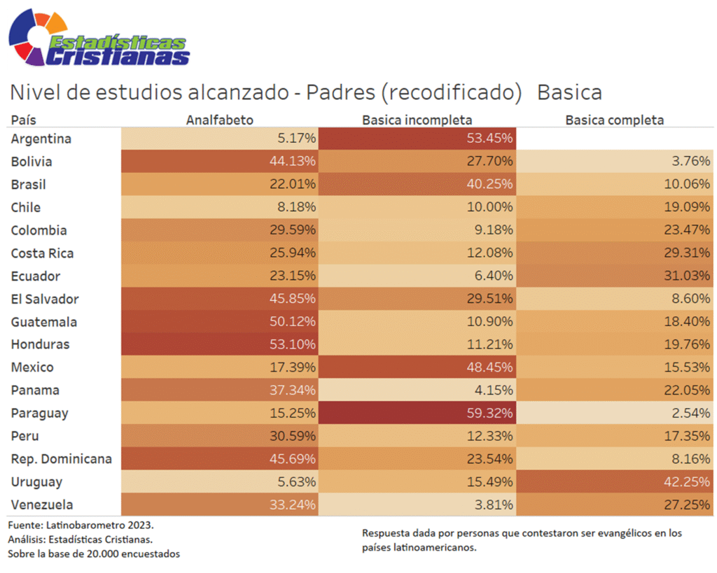 Guatemala presenta la situación más crítica en analfabetismo con 23.85%, donde casi 1 de cada 4 evangélicos adultos no sabe leer ni escribir, limitación devastadora para participación en comunidades protestantes centradas en lectura bíblica. Honduras (18.18%) muestra casi 1 de cada 5 analfabetos, seguido por El Salvador (12.63%) con más de 1 de cada 10. Bolivia (10.80%) y Perú (9.13%) también superan el 9% de analfabetismo. En contraste, Chile (0.83%), Paraguay (1.33%), Brasil (1.57%) y México (2.40%) mantienen analfabetismo por debajo del 2.5%, aproximándose a alfabetización universal. Argentina (3.90%), Costa Rica (3.39%), Colombia (3.26%) y Venezuela (3.08%) presentan aproximadamente 3% de analfabetismo.