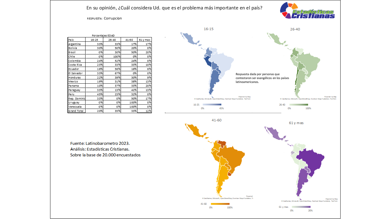 Los datos del Latinobarómetro 2023 revelan que la corrupción se posiciona como uno de los problemas más importante identificado por los evangélicos latinoamericanos. En el análisis por edades, observamos que el grupo de 16-15 años muestra la mayor preocupación, seguido por los grupos de 26-40, 41-60 y 61 y más años. Esta tendencia generalizada refleja una percepción uniforme across generaciones, donde países como Perú (45%), Argentina (53%) y Honduras (25%) encabezan las cifras más altas de preocupación por corrupción entre la población evangélica encuestada.