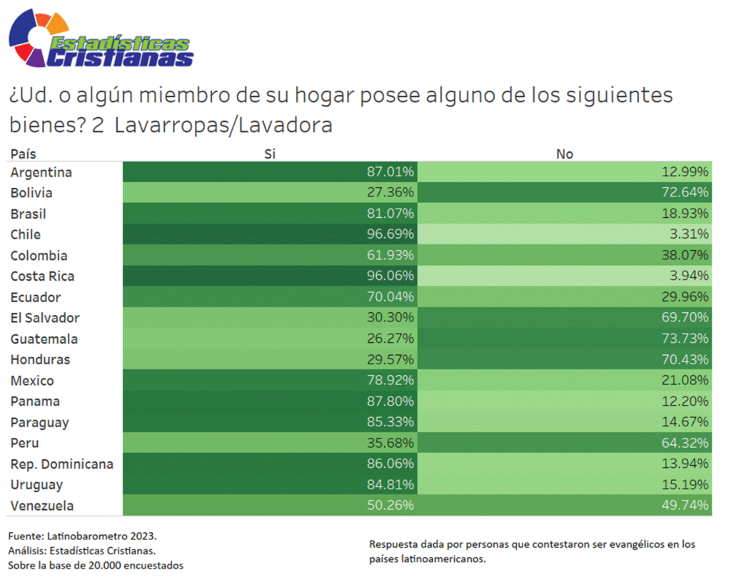 Los datos del Latinobarómetro 2023 revelan marcadas disparidades en la posesión de lavarropas entre evangélicos latinoamericanos. Chile lidera con 96.69%, seguido muy de cerca por Costa Rica con 96.06%, evidenciando acceso casi universal a este electrodoméstico. Panamá (87.80%), Argentina (87.01%), República Dominicana (86.06%) y Paraguay (85.33%) superan el 85%, conformando un grupo con alta penetración. Uruguay (84.81%), Brasil (81.07%) y México (78.92%) mantienen tasas superiores al 78%. En contraste, Guatemala registra apenas 26.27%, Bolivia 27.36%, Honduras 29.57% y El Salvador 30.30%, todos por debajo del 31%, revelando limitaciones severas en el acceso a tecnología básica del hogar.