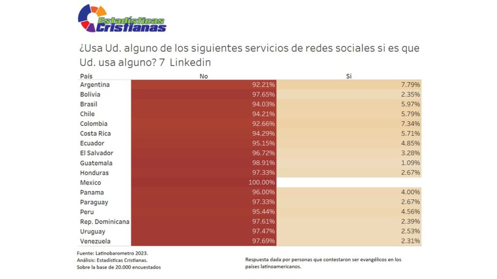 El uso de LinkedIn es prácticamente inexistente entre evangélicos latinoamericanos, con un promedio regional de apenas 4%. Argentina lidera con 7.79%, seguido por Colombia (7.34%), Brasil (5.97%), Chile (5.79%) y Costa Rica (5.71%). En el extremo opuesto, México (0.00%), Guatemala (1.09%), Bolivia (2.35%) y Venezuela (2.31%) presentan presencias casi nulas, indicando que menos de uno de cada cincuenta evangélicos en estos países utiliza LinkedIn. Esta distribución revela que incluso en los países con mayor adopción, menos del 8% de evangélicos accede a esta plataforma profesional, contrastando dramáticamente con la penetración de redes sociales orientadas a entretenimiento y estableciendo LinkedIn como la red social menos utilizada entre comunidades evangélicas latinoamericanas.