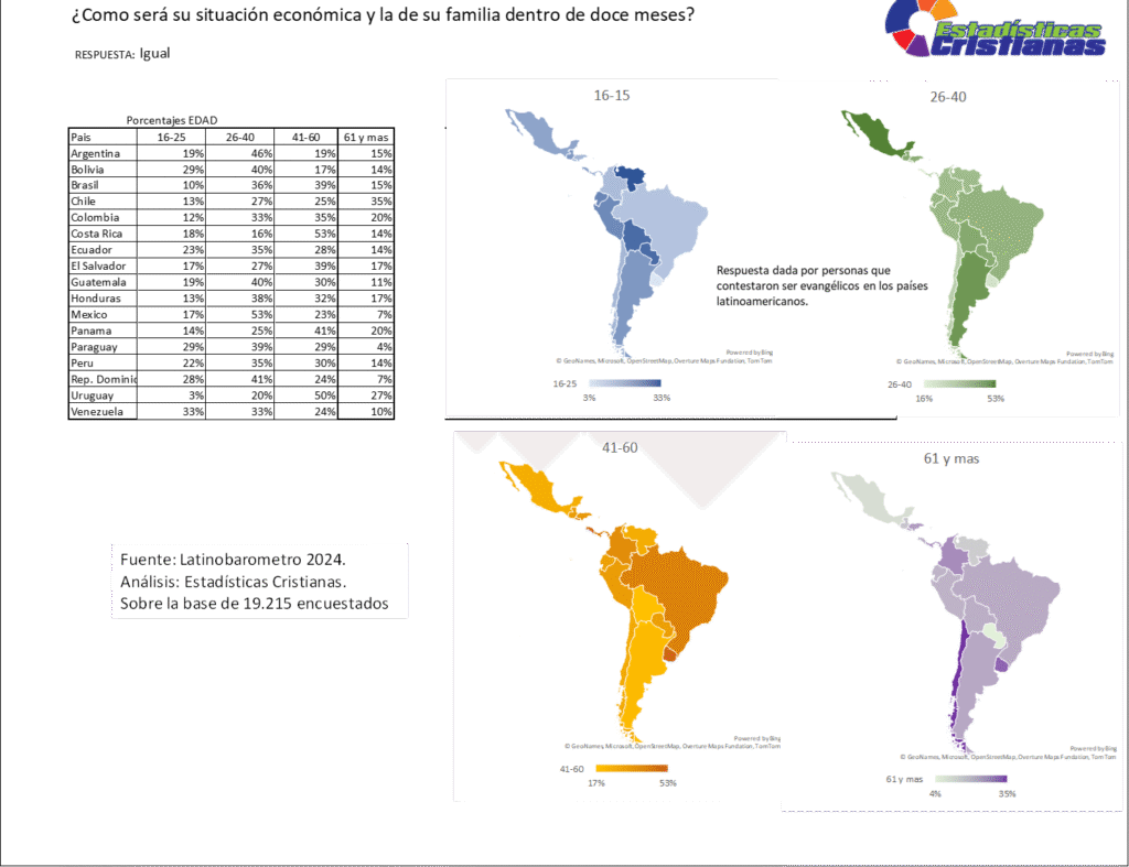 El fenómeno de la expectativa de estabilidad económica, definida bajo la premisa de una situación que se mantendrá «Igual» en los próximos doce meses, revela una configuración compleja de resiliencia y realismo entre los 19,215 evangélicos encuestados en América Latina según el Latinobarómetro 2024. Este análisis identifica que la percepción de continuidad financiera no es uniforme, sino que fluctúa significativamente según el rango etario y la ubicación geográfica, destacando grupos con porcentajes de respuesta elevados como el sector de 41-60 años en Costa Rica con un 53%, y el de 26-40 años en México con el mismo 53%. Otros puntos de alta concentración estadística se observan en Uruguay con un 50% en el segmento de 41-60 años, y en Argentina donde el 46% del grupo de 26-40 años prevé que su economía no variará. Esta tendencia hacia la previsión de una «meseta» económica sugiere una mentalidad de preservación del statu quo en contextos de volatilidad regional, donde la ausencia de deterioro se percibe, en muchos casos, como una forma de éxito relativo frente a las crisis sistémicas que atraviesa el continente.