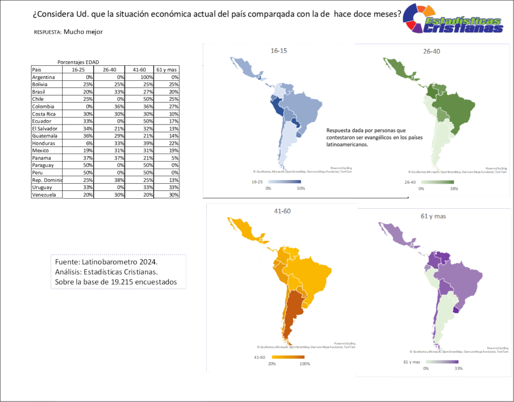 El grupo etario de 16-25 años evidencia niveles variables de percepción de mejora económica, con Paraguay y Perú compartiendo el liderazgo con 50% cada uno, seguidos por Panamá con 37%, Guatemala con 36%, El Salvador con 34%, Ecuador con 33%, Uruguay con 33%, Costa Rica con 30%, Brasil con 20%, Bolivia y Chile ambos con 25%, Venezuela con 20%, México con 19%, Honduras con 6%, Colombia con 0%, mientras Argentina y República Dominicana registran 0% y 25% respectivamente. Los mapas indican que este segmento representa entre 0% y 50% de los evangélicos que perciben mejora económica significativa, revelando que los jóvenes adultos evangélicos muestran optimismo económico heterogéneo, posiblemente relacionado con experiencias diferenciadas de acceso laboral, emprendimiento, educación superior y movilidad social en contextos nacionales diversos, demandando políticas públicas que amplíen oportunidades económicas para nuevas generaciones mientras las comunidades evangélicas proveen formación en principios bíblicos de trabajo, ahorro y mayordomía responsable.