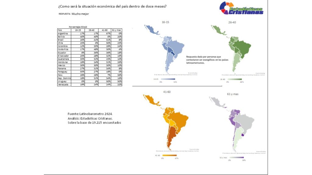 El grupo etario de 16-25 años evidencia niveles significativos de expectativa de mejora económica significativa, con Paraguay liderando dramáticamente con 55%, seguido por Bolivia con 40%, Guatemala con 35%, Perú con 29%, El Salvador con 28%, Chile con 25%, Panamá con 27%, Honduras con 19%, Ecuador con 9%, Costa Rica con 17%, Colombia con 12%, México con 10%, Brasil con 20%, mientras Argentina, República Dominicana, Uruguay y Venezuela registran 0%, 18%, 0% y 13% respectivamente. Los mapas indican que este segmento representa entre 0% y 55% de los evangélicos que esperan mejora significativa, revelando que los jóvenes adultos evangélicos mantienen optimismo prospectivo heterogéneo, posiblemente relacionado con idealismo generacional no erosionado completamente por décadas de desilusiones, expectativas de oportunidades emergentes en economías digitales o innovadoras, o simplemente fe juvenil que se resiste a cinismo paralizante, demandando políticas públicas que transformen esperanza en oportunidades reales de empleo juvenil y emprendimiento mientras las comunidades evangélicas nutren optimismo saludable basado en principios bíblicos de trabajo diligente y confianza en provisión divina sin promesas vacías de prosperidad automática.