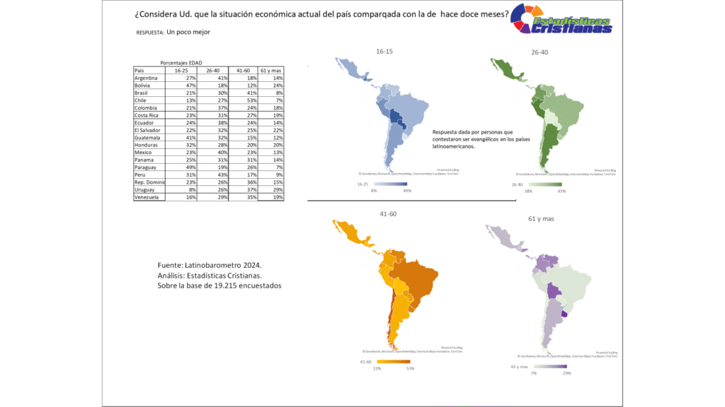 Los evangélicos latinoamericanos que consideran que la situación económica actual del país es un poco mejor comparada con la de hace doce meses exhiben patrones diferenciados según grupo etario y contexto nacional, reflejando optimismo económico cauteloso. El segmento de 26-40 años presenta las concentraciones más elevadas de optimismo moderado, destacando Perú con 43%, Argentina con 41%, México con 40%, Ecuador con 38% y Colombia con 37%. Los grupos de 41-60 años muestran niveles sustanciales, liderados por Chile con 53%, Brasil con 41%, Uruguay con 37%, República Dominicana con 36% y Venezuela con 35%. La franja de 16-25 años presenta porcentajes variables, con Bolivia alcanzando 47%, Paraguay con 49%, Guatemala con 41%, Honduras con 32%, Perú con 31% y Argentina con 27%. El grupo de 61 años y más registra cifras moderadas, encabezado por Uruguay con 29%, Bolivia con 24%, El Salvador con 22%, Honduras con 20% y Colombia con 18%. Los datos de 19,215 encuestados revelan que la percepción de mejora económica moderada constituye una evaluación mayoritaria en varios contextos nacionales evangélicos.
