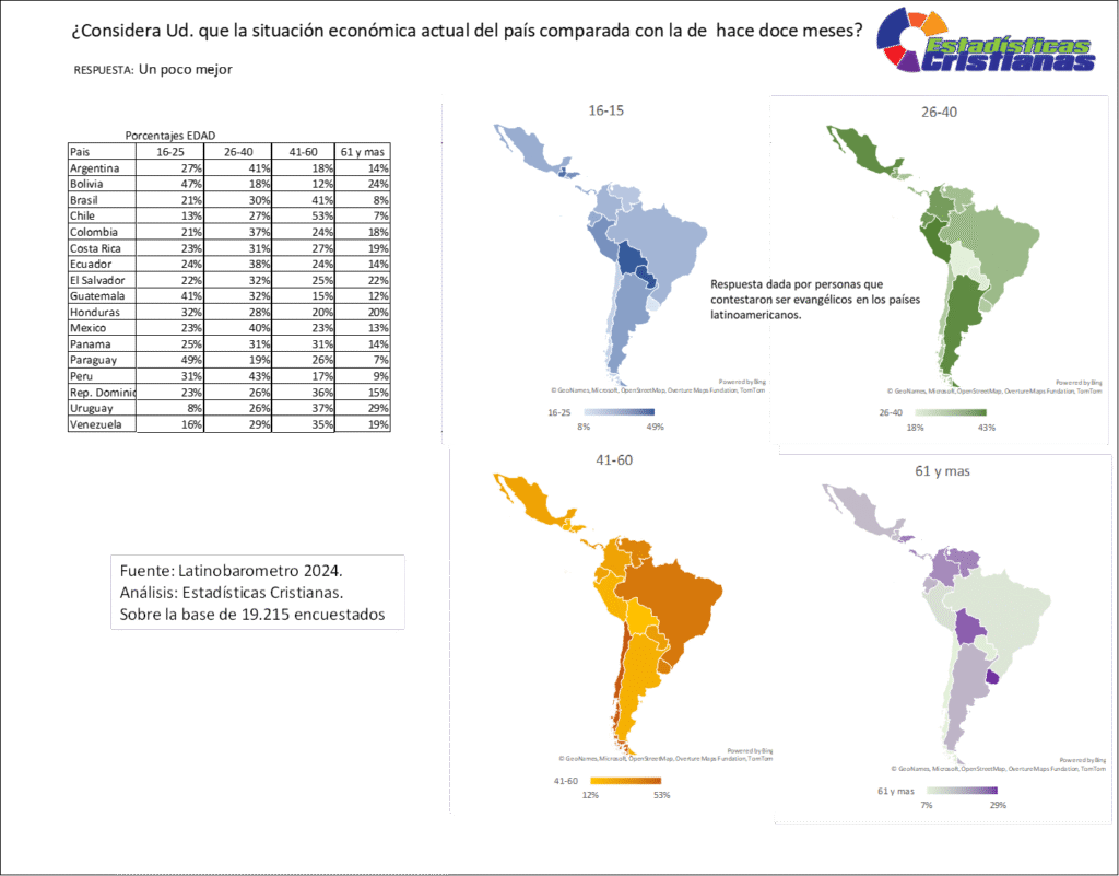 Los evangélicos latinoamericanos que consideran que la situación económica actual del país es un poco mejor comparada con la de hace doce meses exhiben patrones diferenciados según grupo etario y contexto nacional, reflejando optimismo económico cauteloso. El segmento de 26-40 años presenta las concentraciones más elevadas de optimismo moderado, destacando Perú con 43%, Argentina con 41%, México con 40%, Ecuador con 38% y Colombia con 37%. Los grupos de 41-60 años muestran niveles sustanciales, liderados por Chile con 53%, Brasil con 41%, Uruguay con 37%, República Dominicana con 36% y Venezuela con 35%. La franja de 16-25 años presenta porcentajes variables, con Bolivia alcanzando 47%, Paraguay con 45%, Guatemala con 41%, Honduras con 32%, Perú con 31% y Argentina con 27%. El grupo de 61 años y más registra cifras moderadas, encabezado por Uruguay con 29%, Bolivia con 24%, El Salvador con 22%, Honduras con 20% y Colombia con 18%. Los datos de 19,215 encuestados revelan que la percepción de mejora económica moderada constituye una evaluación mayoritaria en varios contextos nacionales evangélicos.