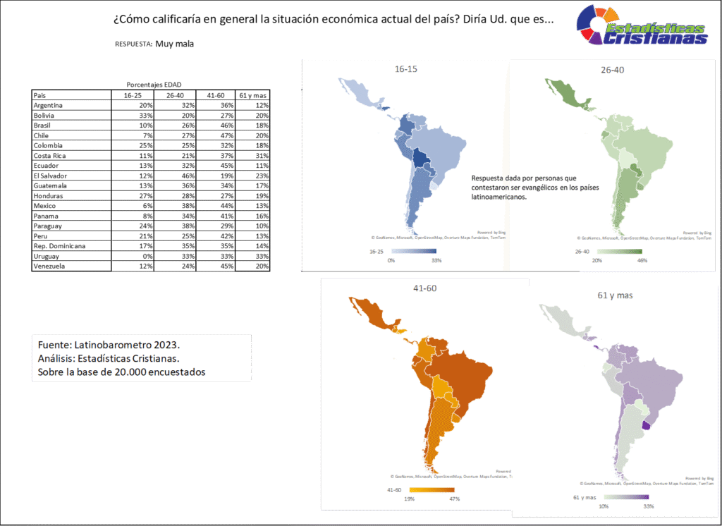 El Latinobarómetro 2023 revela que los evangélicos latinoamericanos perciben una crisis económica generalizada, con porcentajes superiores al 20% calificando la situación como «muy mala» en la mayoría de países y grupos etarios. Esta percepción trasciende fronteras nacionales y generacionales, evidenciando desafíos económicos estructurales que afectan particularmente a comunidades de fe. Los datos indican que países como Venezuela, Brasil, Ecuador y El Salvador concentran las percepciones más críticas, mientras que la consistencia de estos porcentajes a través de diferentes grupos etarios confirma una crisis económica percibida de manera transversal en el evangelismo latinoamericano.