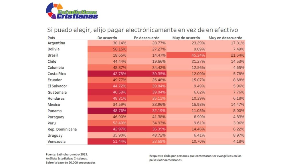 La tendencia predominante muestra una inclinación moderada hacia los pagos electrónicos entre evangélicos latinoamericanos cuando tienen opción de elegir. Bolivia lidera con 56.15% «De acuerdo», seguido por Perú (52.40%) y Venezuela (51.44%). Ecuador registra 48.37% y Honduras 48.31%. En contraste, países como Brasil muestran menor preferencia con solo 18.65% «De acuerdo», mientras que Argentina presenta 30.14% y México 34.59%. Esta distribución sugiere que aproximadamente la mitad de los evangélicos en varios países prefiere utilizar medios de pago electrónicos cuando ambas opciones están disponibles.