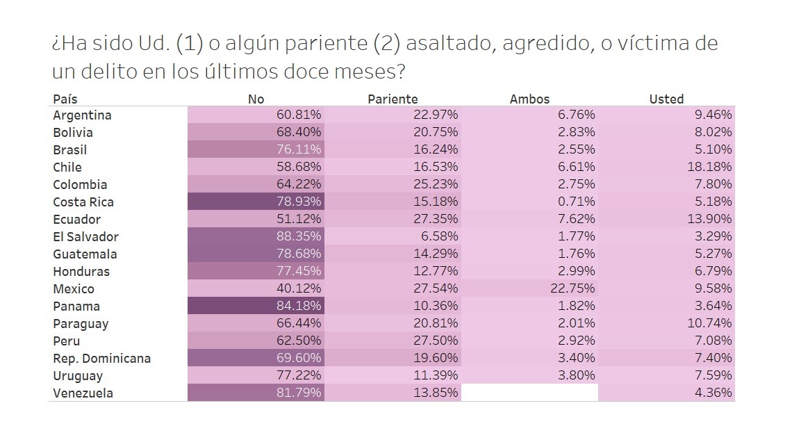 La categoría «Pariente» muestra concentraciones notables en ciertos países: Perú lidera con 27.50%, seguido por Ecuador (27.35%) y México (27.54%). Colombia registra 25.23% y Argentina 22.97%. Esta tendencia indica que aproximadamente una cuarta parte de los evangélicos en estos países ha experimentado victimización indirecta a través de familiares cercanos. La victimización familiar genera impacto psicológico y social significativo en las comunidades religiosas, extendiendo las consecuencias del delito beyond las víctimas directas.