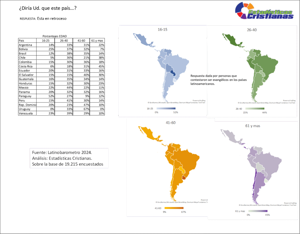 Los datos del Latinobarómetro 2024 revelan patrones generacionales sobre percepciones de retroceso nacional entre evangélicos latinoamericanos que respondieron «Este país está en retroceso». Entre jóvenes de 16-25 años, Paraguay lidera con 52%, seguido por Bolivia (25%), Venezuela (23%), México (22%) y Ecuador (20%), donde aproximadamente un quinto o más percibe retroceso nacional. En adultos de 26-40 años, México alcanza 44%, seguida por Perú (41%), Venezuela (39%), Brasil (38%) y Bolivia (37%), evidenciando pesimismo significativo entre adultos económicamente activos. Entre adultos de 41-60 años, Uruguay lidera dramáticamente con 67%, seguido por República Dominicana (47%), El Salvador (40%), Colombia (36%) y Brasil (35%). En mayores de 61 años, Costa Rica alcanza 45%, seguida por Chile (38%), El Salvador (30%) y Honduras (23%), mostrando pesimismo sustancial en algunas generaciones mayores.