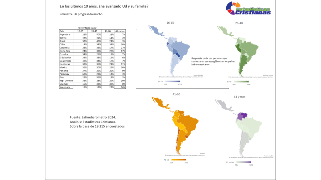 El grupo de 61 años y más presenta porcentajes moderados de percepción de progreso social significativo decenal, con patrones que reflejan evaluación de última década de vida activa. Venezuela lidera con 36%, seguido por Colombia con 27%, Chile con 10%, República Dominicana con 10%, México con 10%, Uruguay con 8%, Argentina con 7%, Ecuador con 7%, Honduras con 11%, Costa Rica con 17%, mientras Bolivia, Brasil, El Salvador, Guatemala, Panamá, Paraguay y Perú registran 3%, 3%, 6%, 7%, 9%, 3% y 3% respectivamente. La visualización cartográfica indica que este segmento representa entre 3% y 36% de los adultos mayores que perciben progreso decenal significativo, evidenciando que los adultos mayores evangélicos experimentan movilidad ascendente en última década de manera heterogénea, posiblemente reflejando mejoras en sistemas de pensiones que incrementaron ingresos significativamente, herencias recibidas o liquidaciones laborales que generaron capital final, apoyo económico sustantivo de hijos adultos profesionalmente exitosos que transformaron condiciones materiales de padres ancianos, o simplemente gratitud por década final que trajo dignidad económica después de vida de trabajo y sacrificio, demandando políticas públicas que garanticen que progreso decenal sea norma y no excepción en vejez mientras ministerios eclesiales celebran provisión divina que honra fidelidad de toda una vida y reconocen que progreso material en edad avanzada constituye bendición que debe inspirar gratitud profunda y generosidad hacia generaciones más jóvenes que aspiran a experimentar movilidad similar.