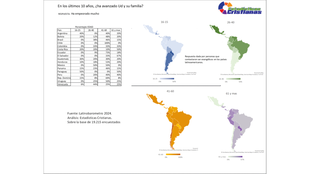 El grupo etario de 16-25 años evidencia niveles críticos de percepción de retroceso social severo en contextos específicos, con Paraguay liderando dramáticamente con 50%, seguido por Argentina con 40%, Guatemala con 30%, Costa Rica con 20%, Bolivia con 20%, Panamá con 15%, República Dominicana con 15%, Honduras con 10%, Venezuela con 6%, mientras Brasil, Chile, Colombia, Ecuador, El Salvador, México, Perú y Uruguay registran 0%, 0%, 0%, 0%, 0%, 0%, 0% y 0% respectivamente. Los mapas indican que este segmento representa entre 0% y 50% de los evangélicos jóvenes que perciben retroceso familiar severo decenal, revelando que los jóvenes adultos evangélicos enfrentan catástrofe social generacional en varios países, posiblemente relacionado con observación directa de colapso familiar completo durante su desarrollo que destruyó patrimonio acumulado, pérdida total de acceso a educación por crisis económicas devastadoras, inserción laboral imposible o empleos de supervivencia extrema, o simplemente trauma generacional por constatar que década destruyó completamente esperanzas de vida digna para sus familias, demandando declaración de emergencia humanitaria juvenil y movilización total de recursos eclesiales y gubernamentales para rescatar generación que enfrenta desesperanza absoluta ante colapso social que aniquila futuro.