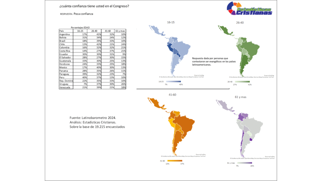 La respuesta «Poca confianza» ante la pregunta sobre el nivel de confianza en el Congreso, registrada en el Latinobarómetro 2024 sobre una base de 19,215 encuestados evangélicos de diecisiete países latinoamericanos, configura un cuadro de escepticismo institucional moderado pero extendido que atraviesa generaciones y geografías con una consistencia que merece análisis pastoral y político urgente. Es en el grupo etario de 16 a 25 años donde la variación es más pronunciada, con Paraguay encabezando con 39%, seguido por Perú con 40%, Ecuador con 30%, Guatemala con 33% y Bolivia con 31%, mientras que Uruguay apenas alcanza el 7% y Chile el 13%, configurando un rango del 7% al 40%. En la cohorte de 26 a 40 años, Argentina lidera con 41%, seguida por Chile con 42%, México con 40%, Brasil con 39% y Venezuela con 39%, con un rango del 27% al 42% que revela una desconfianza más uniforme y consolidada en la generación de mediana edad activa. El patrón general que emerge de los datos es que la «poca confianza» en el Congreso no es una actitud residual ni marginal en el evangelicalismo latinoamericano, sino una postura mayoritaria en numerosos países y cohortes, lo que interpela directamente a las iglesias sobre su responsabilidad en la formación de ciudadanos que, más allá del escepticismo, sepan transformar la crítica en acción cívica constructiva.