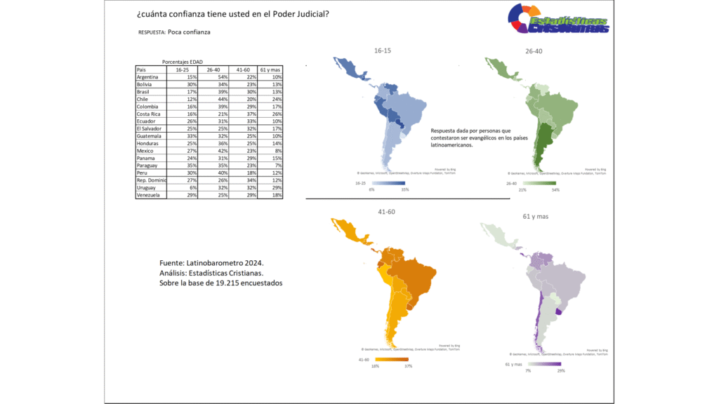 La respuesta «poca confianza» en el Poder Judicial entre los evangélicos latinoamericanos constituye, en el marco del Latinobarómetro 2024 sobre la base de 19.215 encuestados, una señal de alerta institucional de primera magnitud, pues a diferencia de la desconfianza total —que puede leerse como un rechazo definitivo— la poca confianza expresa una relación deteriorada pero no del todo rota, una decepción activa que reconoce la existencia del sistema judicial pero evalúa su funcionamiento como insuficiente, parcial o directamente injusto. En el grupo de 16 a 25 años, Argentina sobresale con apenas 15% y Uruguay con solo 6%, mientras que Guatemala alcanza 33%, Paraguay 35% y Venezuela 29%, revelando que incluso entre los más jóvenes la poca confianza ya configura una categoría de peso en varios países. En el grupo de 26 a 40 años, Argentina lidera con un preocupante 54%, seguida por Chile con 44% y México con 42%, señalando que en la adultez temprana la decepción judicial alcanza su punto más alto en varios de los países más grandes de la región. Entre los de 41 a 60 años, Costa Rica encabeza con 37%, Rep. Dominicana con 34% y Colombia con 29%, mientras que en el grupo de 61 años y más, Uruguay lidera con 29%, Chile con 24% y Costa Rica con 26%, completando un cuadro donde la escala va del 7% al 29% según los mapas. Este escenario revela que la poca confianza judicial no es un fenómeno marginal sino una corriente transversal que atraviesa generaciones y contextos nacionales, interpelando con urgencia tanto a las instituciones del Estado como a las comunidades evangélicas que las habitan.