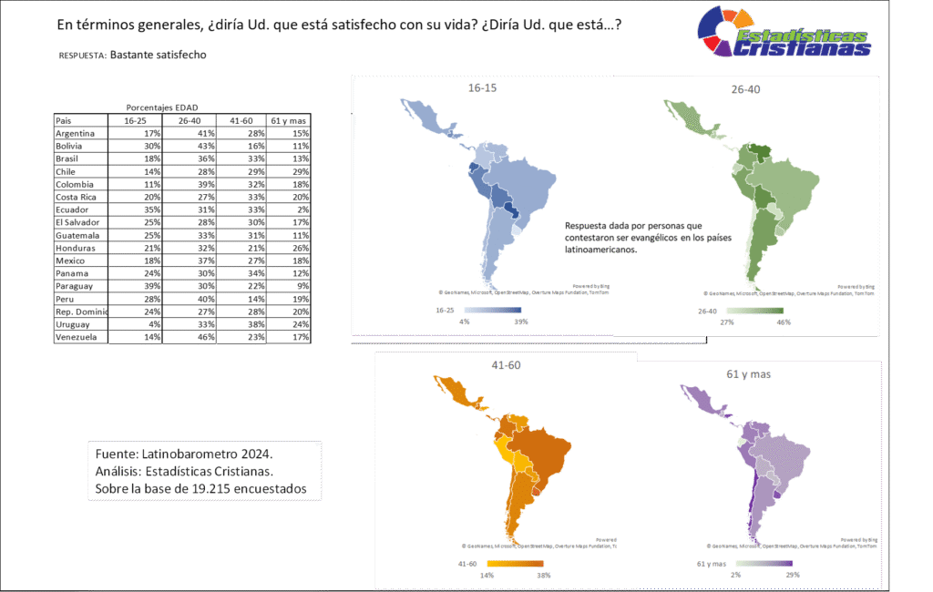 El grupo de 61 años y más presenta porcentajes variables pero significativos de satisfacción bastante elevada, con patrones diferenciados entre países. Chile y Uruguay comparten el liderazgo con 29% cada uno, seguidos por Honduras con 26%, Uruguay con 24%, Costa Rica con 20%, Perú con 19%, Colombia y México ambos con 18%, El Salvador con 17%, Argentina con 15%, Brasil con 13%, Venezuela con 17%, Guatemala con 11%, Bolivia con 11%, Panamá con 12%, Paraguay con 9% y República Dominicana con 20%. La visualización cartográfica indica que este segmento representa entre 2% y 29% de los bastante satisfechos, evidenciando que los adultos mayores evangélicos mantienen niveles apreciables de satisfacción moderadamente alta, aunque enfrentan desafíos específicos de esta etapa del ciclo vital que pueden limitar su bienestar óptimo, mientras su fe continúa proveyendo sostén espiritual y comunitario significativo en la vejez.