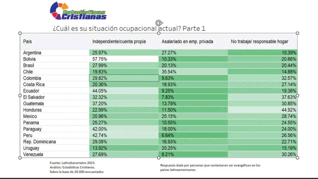 El trabajo y la vocación encuentran fundamento bíblico en Colosenses 3:23: «Y todo lo que hagáis, hacedlo de corazón, como para el Señor y no para los hombres». La diversidad ocupacional entre evangélicos latinoamericanos refleja contextos económicos variados donde algunos prosperan como emprendedores independientes, otros acceden a empleos formales asalariados, y minorías significativas enfrentan desempleo o responsabilidades exclusivas de hogar. Aproximadamente 30% trabajando independientemente sugiere espíritu emprendedor significativo o, alternativamente, economías informales masivas donde autoempleo representa supervivencia ante ausencia de empleos formales. Las iglesias evangélicas pueden potenciar emprendimiento mediante capacitación en administración, microcréditos, cooperativas y redes de apoyo que transformen necesidad en oportunidad, mientras simultáneamente abogan por creación de empleos formales dignos que ofrezcan seguridad social y estabilidad económica superior a precariedad de informalidad.