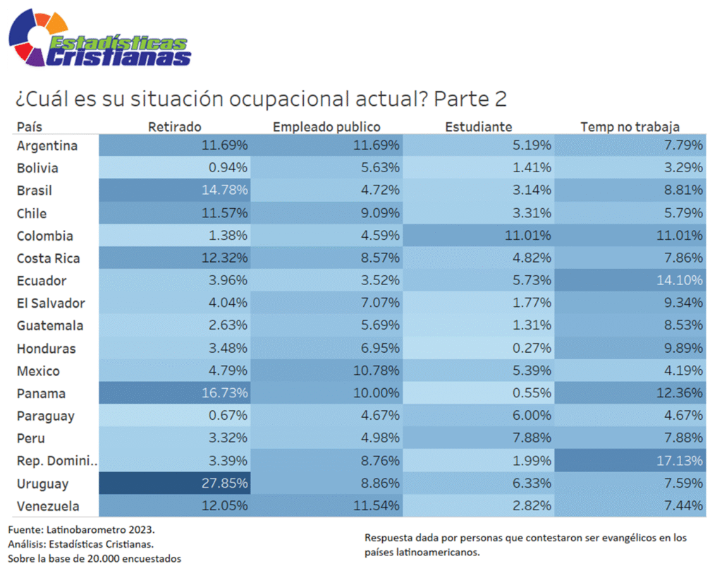La diversidad de situaciones laborales encuentra eco bíblico en 1 Corintios 7:20: «Cada uno en el estado en que fue llamado, en él se quede». La variedad ocupacional entre evangélicos latinoamericanos refleja tanto bendiciones de estabilidad como desafíos de precariedad. Los retirados (promedio 7% regional) representan minorías que alcanzaron estabilidad suficiente para retiro formal, mientras empleados públicos (promedio 7.5%) acceden a empleos frecuentemente más estables que sector privado. Estudiantes (promedio 4%) representan inversión en futuro mediante educación, y trabajadores temporales (promedio 8.5%) enfrentan precariedad crónica sin empleos permanentes. Las iglesias deben ministrar contextualmente a estas realidades diversas, celebrando estabilidad donde existe, apoyando a quienes enfrentan precariedad, y equipando a todos para glorificar a Dios en sus respectivas situaciones ocupacionales.