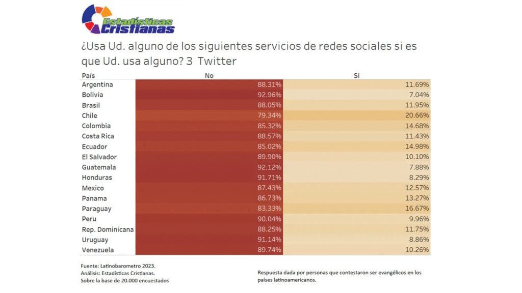En síntesis, el estudio Latinobarómetro 2023 sobre 20,000 encuestados revela que Twitter es la segunda plataforma menos adoptada por evangélicos latinoamericanos con un promedio regional de solo 11.84% de usuarios frente a un 88.16% que no la utiliza. Ningún país supera el 21% de penetración, y doce de dieciséis naciones se mantienen por debajo del 13% de adopción, confirmando que esta red social no ha encontrado cabida en las comunidades de fe de la región. Las características de Twitter —debates polarizados, limitación de caracteres, ambiente frecuentemente hostil, énfasis en noticias políticas controvertidas, cultura de confrontación— no se alinean con los valores evangélicos de edificación, paz, diálogo constructivo y comunicación profunda basada en principios bíblicos. Esta baja adopción representa tanto un diagnóstico sobre las incompatibilidades entre la cultura Twitter y la cultura evangélica, como una validación de que las comunidades de fe latinoamericanas han ejercido discernimiento al priorizar plataformas más adecuadas para sus objetivos ministeriales. Mientras Facebook permite comunidades extensas y YouTube facilita enseñanzas audiovisuales permanentes, Twitter ofrece poco valor para la evangelización, el discipulado o la edificación mutua que constituyen prioridades centrales del cristianismo evangélico. Los datos sugieren que las iglesias y líderes evangélicos deberían concentrar recursos digitales en plataformas con mayor penetración y mejor alineación con valores cristianos, reconociendo que Twitter permanecerá como herramienta marginal para alcance evangélico en el contexto latinoamericano.