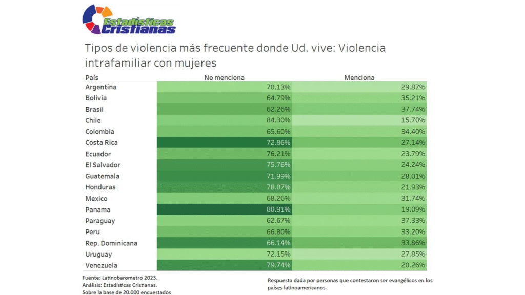 La encuesta demuestra que la violencia intrafamiliar contra mujeres constituye la preocupación más extendida entre los tipos de violencia evaluados, con 11 países superando el 25% de menciones. Los patrones revelan mayor reconocimiento en países sudamericanos específicos y México, mientras que Chile, Panamá y Venezuela presentan índices considerablemente menores, sugiriendo la necesidad de estrategias pastorales y educativas diferenciadas que aborden tanto la prevención como la respuesta comunitaria evangélica ante la violencia de género desde perspectivas bíblicamente fundamentadas.