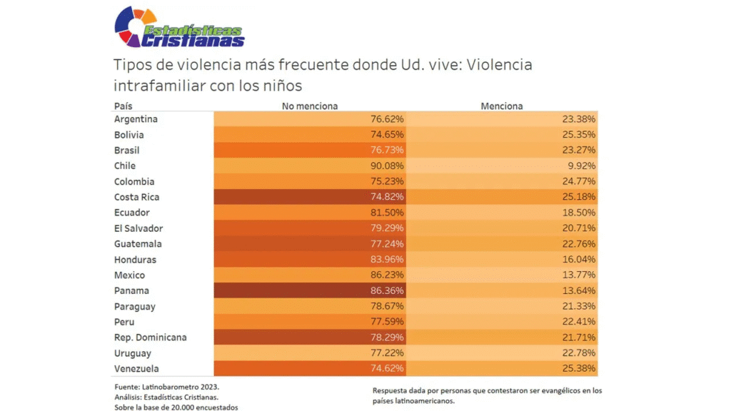 La encuesta demuestra que la violencia intrafamiliar contra niños constituye una preocupación significativa pero variable entre evangélicos latinoamericanos, con 10 países superando el 20% de menciones. Los patrones revelan mayor conciencia en países sudamericanos y centroamericanos específicos, mientras que Chile, México y Panamá presentan índices considerablemente menores, sugiriendo la necesidad de estrategias diferenciadas de prevención y sensibilización que consideren los contextos culturales y socioeconómicos particulares de cada comunidad evangélica nacional.